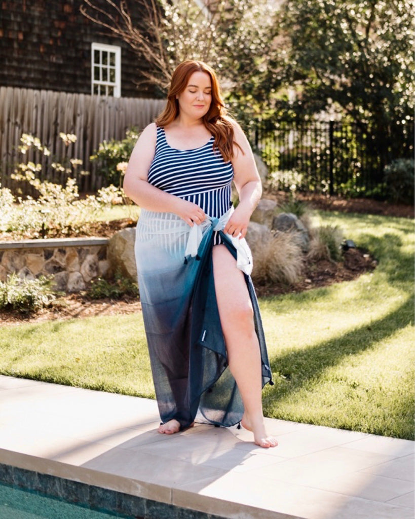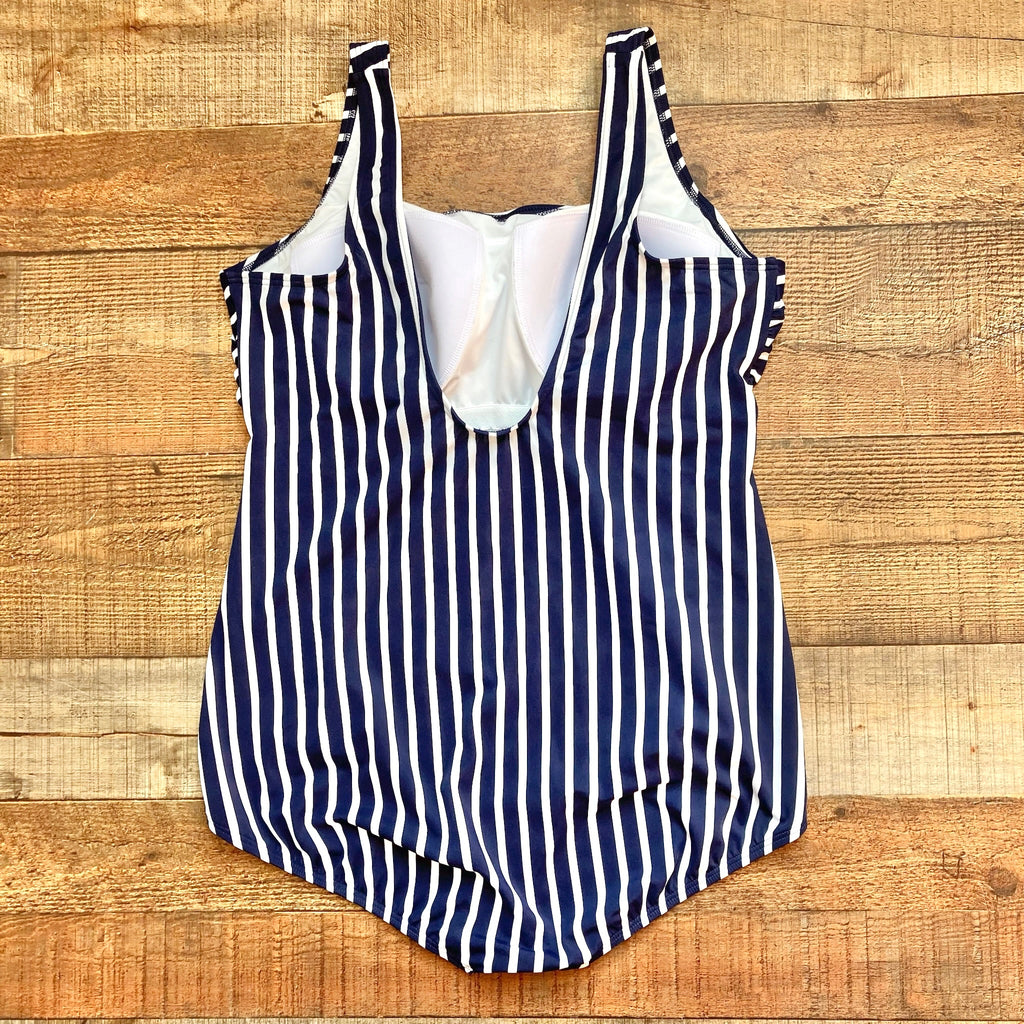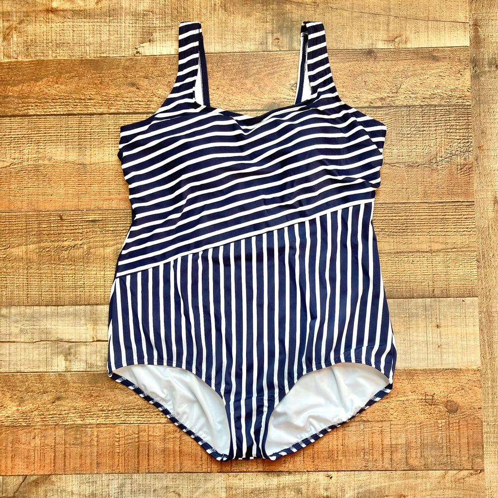 Lands End Deep Sea/White Media Stripe Scoop Neck One Piece- Size 18