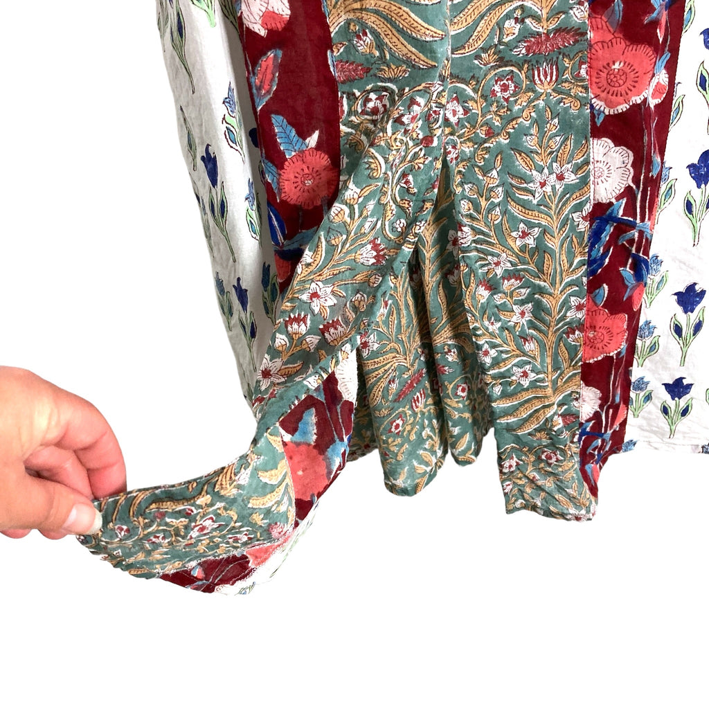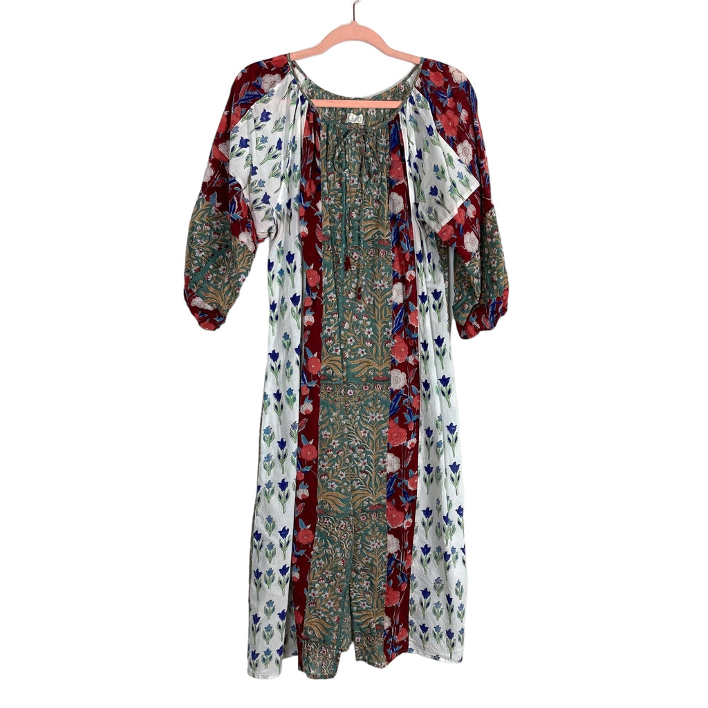 Livro White/Blue/Green/Maroon Floral Print Patchwork Front Tie and Slit Dress- Size L