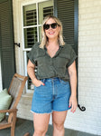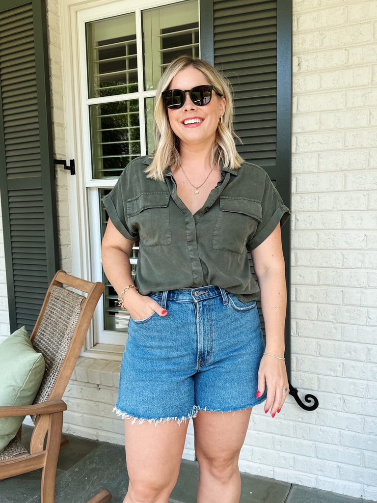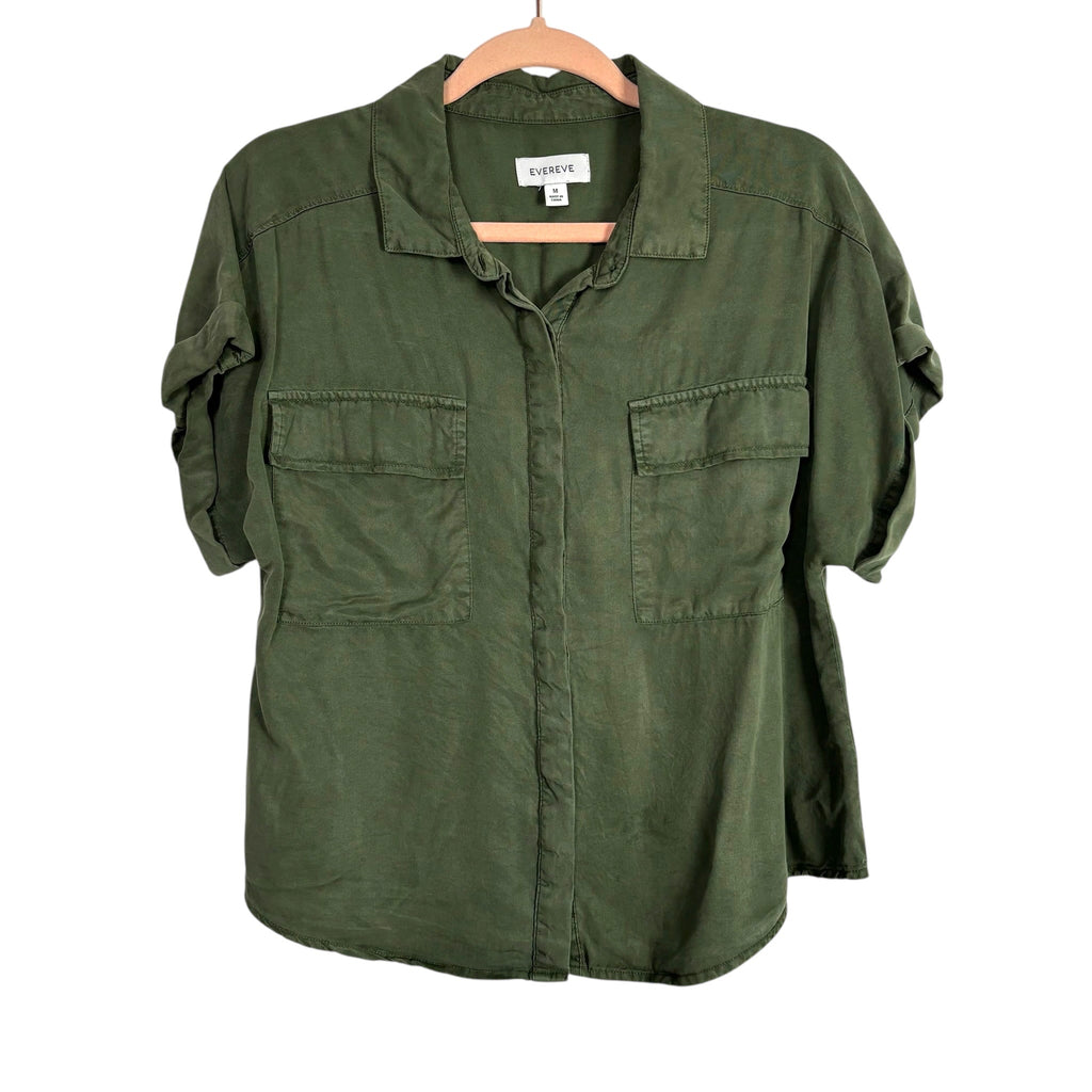 Evereve Army Green Rolled Cuff Hidden Button Up Utility Top- Size M (sold out online)