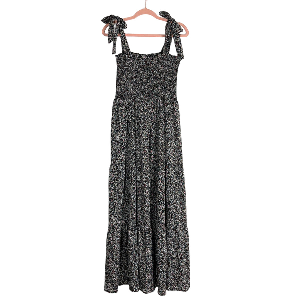 No Brand Black Floral Pattern with Tie Straps Smocked Maxi Dress- Size M