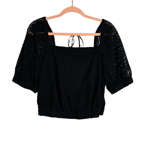 Everlane Black Eyelet Tie Back Elastic Waist Puff Sleeve Top- Size M