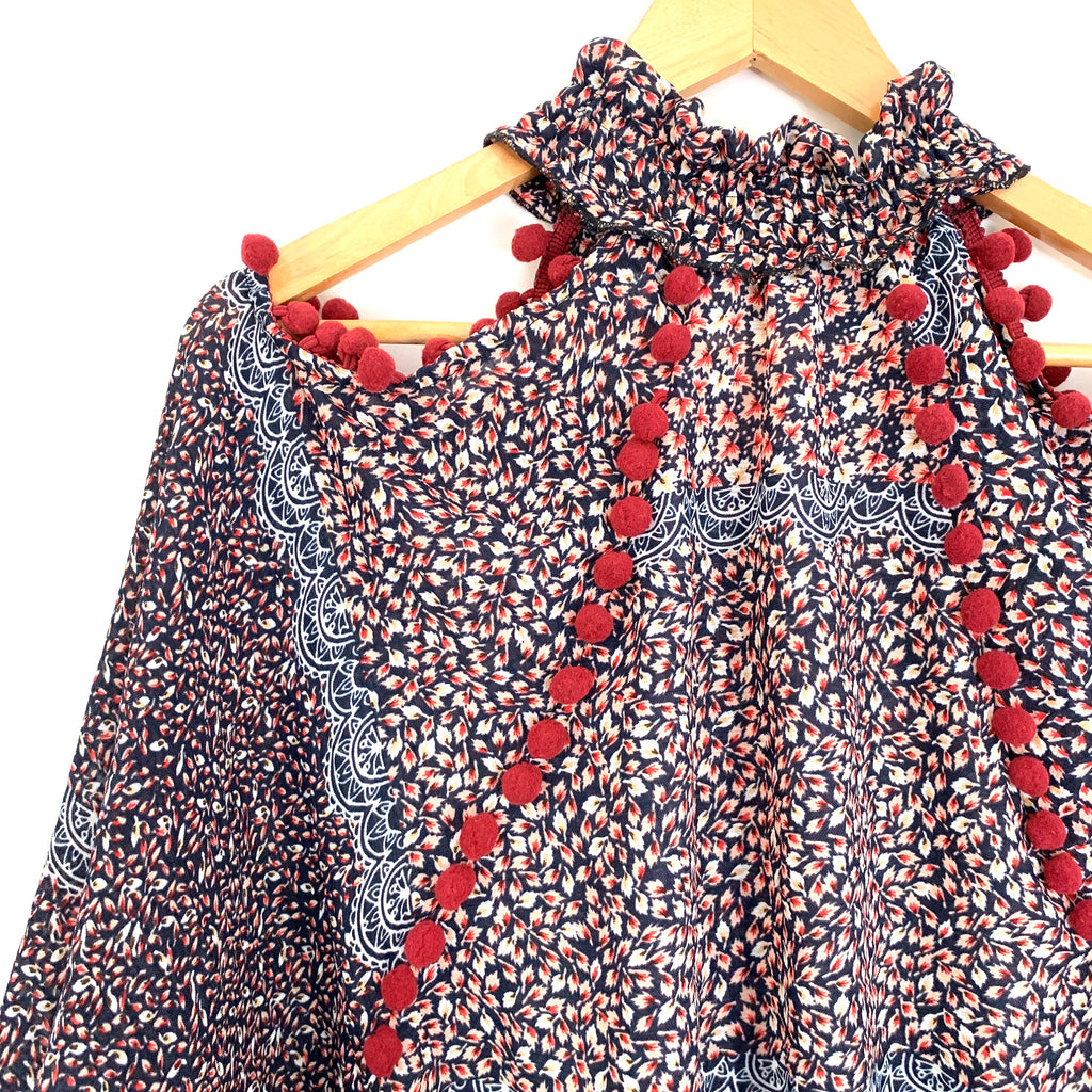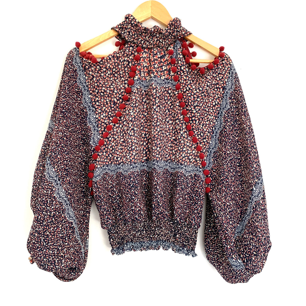 Storets Patterned Bubble Sleeve Pom Pom Blouse- Size S