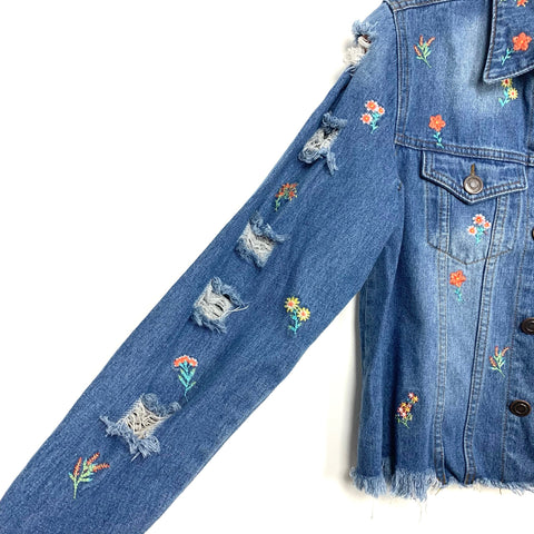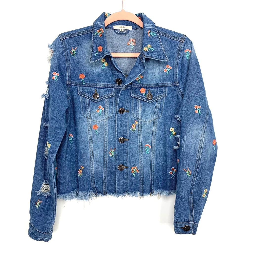Andree By Unit Floral Embroidered Distressed Denim Jacket- Size S