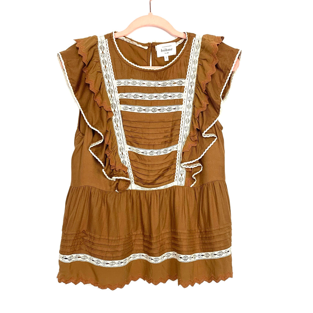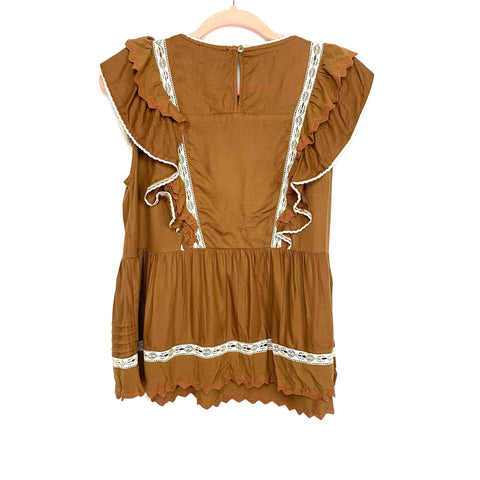 Bohme Camel White Lace Trim Ruffle Blouse- Size S