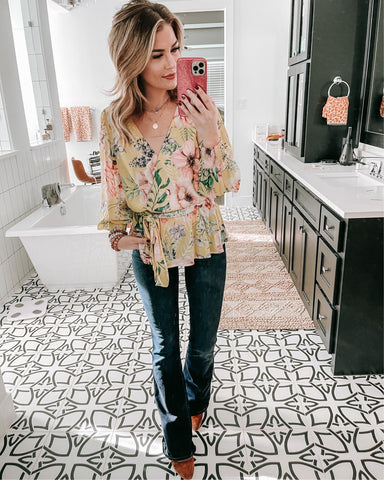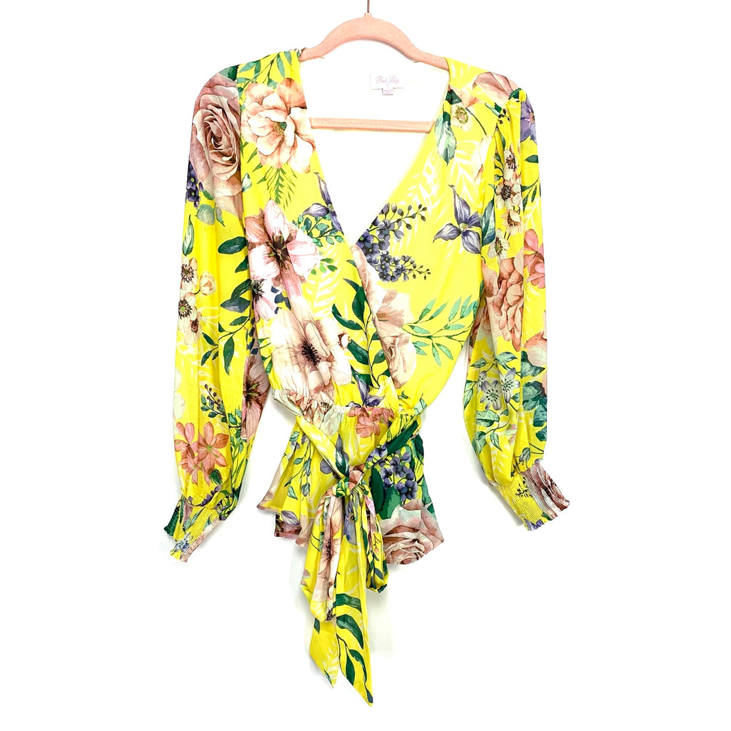 Pink Lily Yellow Floral Elastic Waist Belted Smocked Sleeve Blouse- Size S