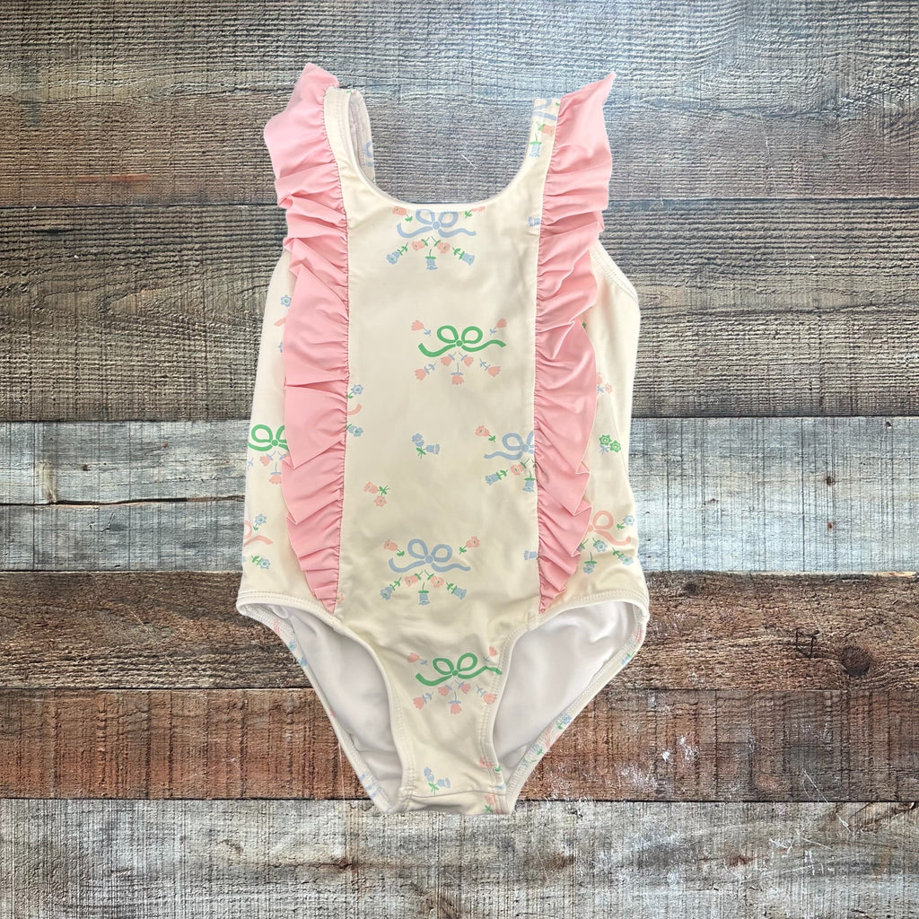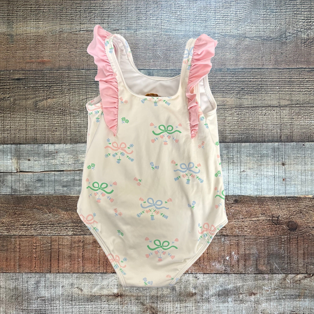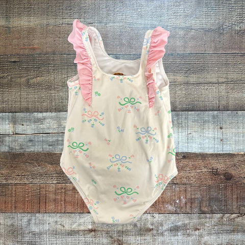 The Beaufort Bonnet Company White Bow/Flower Pink Ruffle Swimsuit - Size 3T