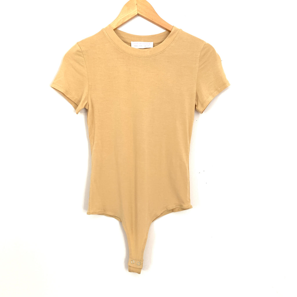 Excuse Me I Have To Go Be Awesome Tan Short Sleeve Thong Bodysuit- Size S