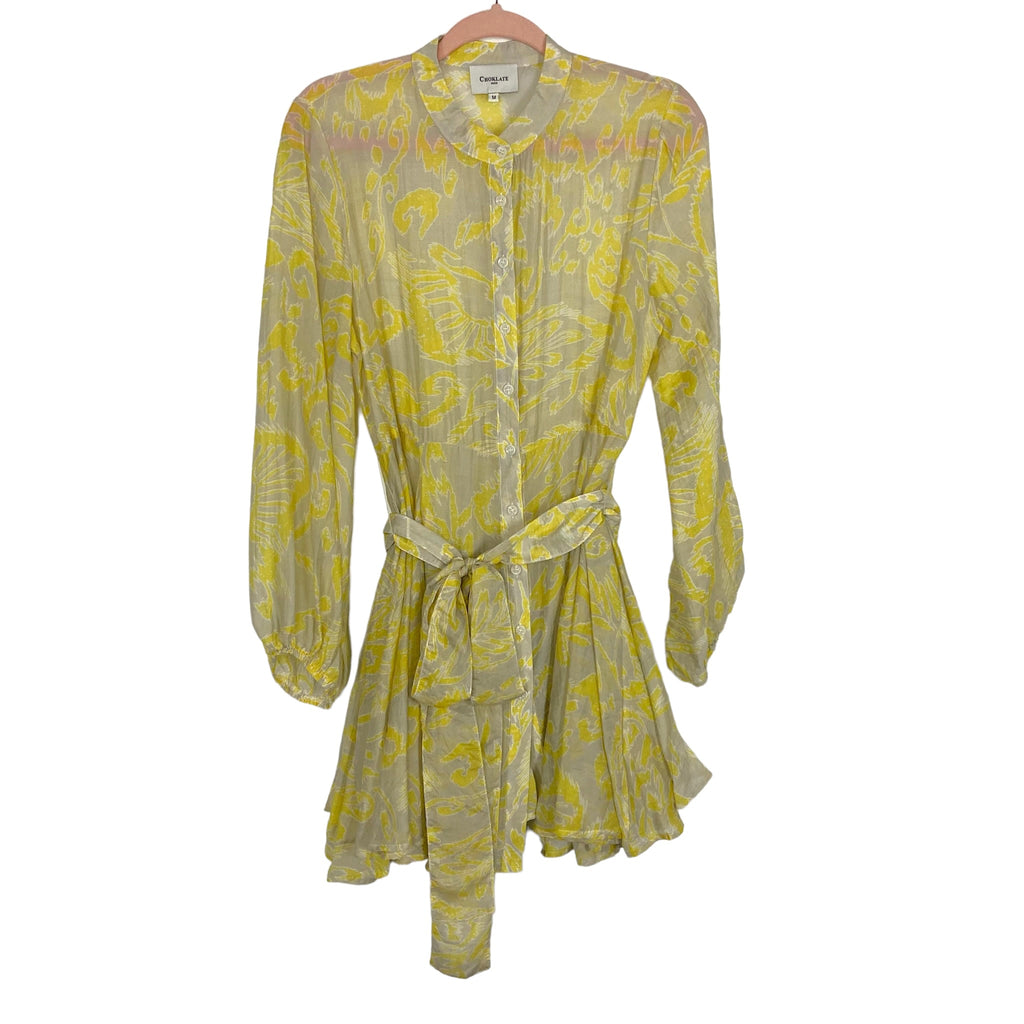 Choklate Paris Yellow Printed Sheer Silk Blend Button Up Belted Dress- Size M