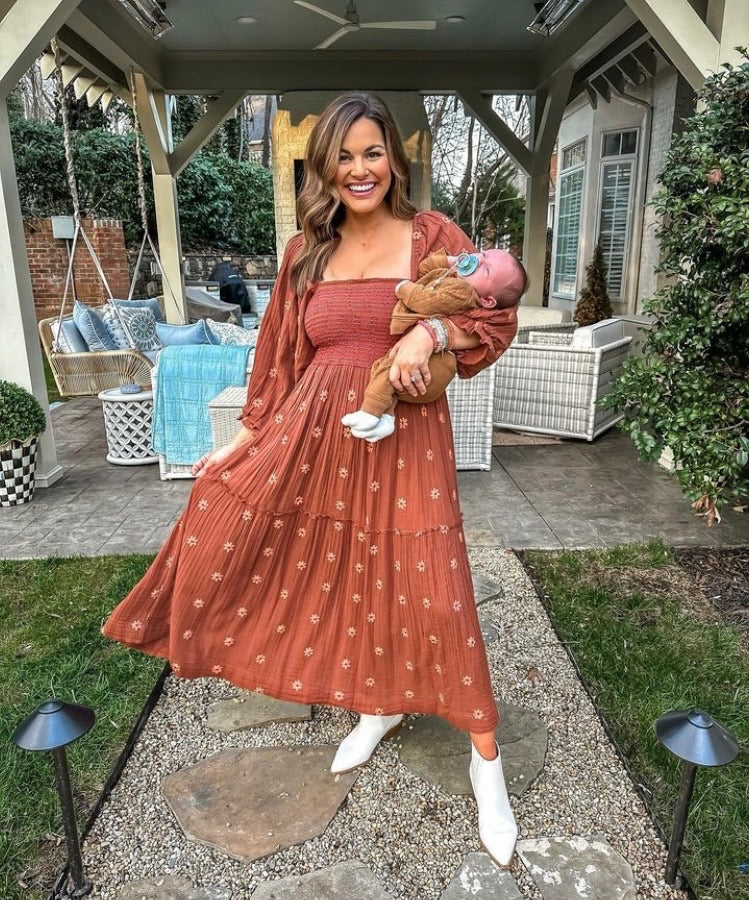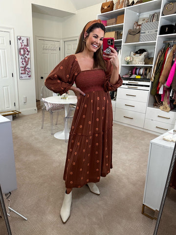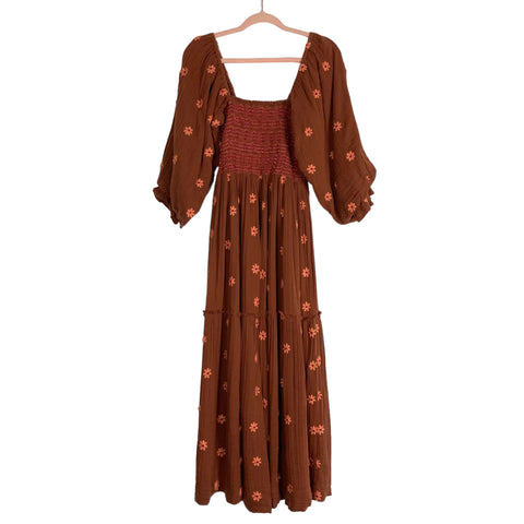 Free People Brown Embroidered Floral Smocked Bodice Dress- Size ~S (see notes)