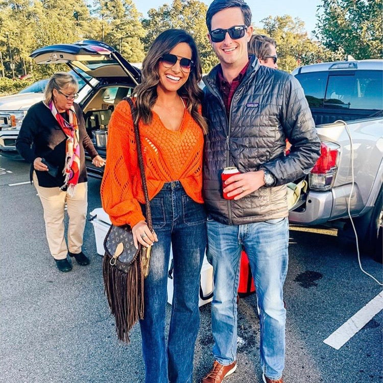 Free People Orange V-Neck Wool Blend Open Knit Bubble Sleeve Sweater- Size S