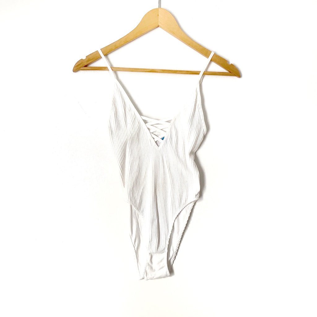 Mind Code White Lace Up Ribbed Bodysuit- Size S/M