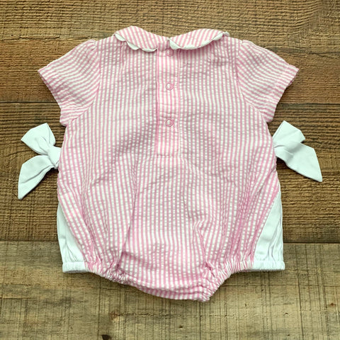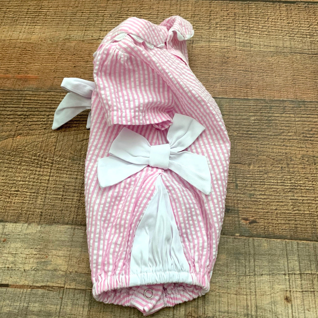 Mudpie Pink Seersucker Side Bow Romper- Size 0-3M