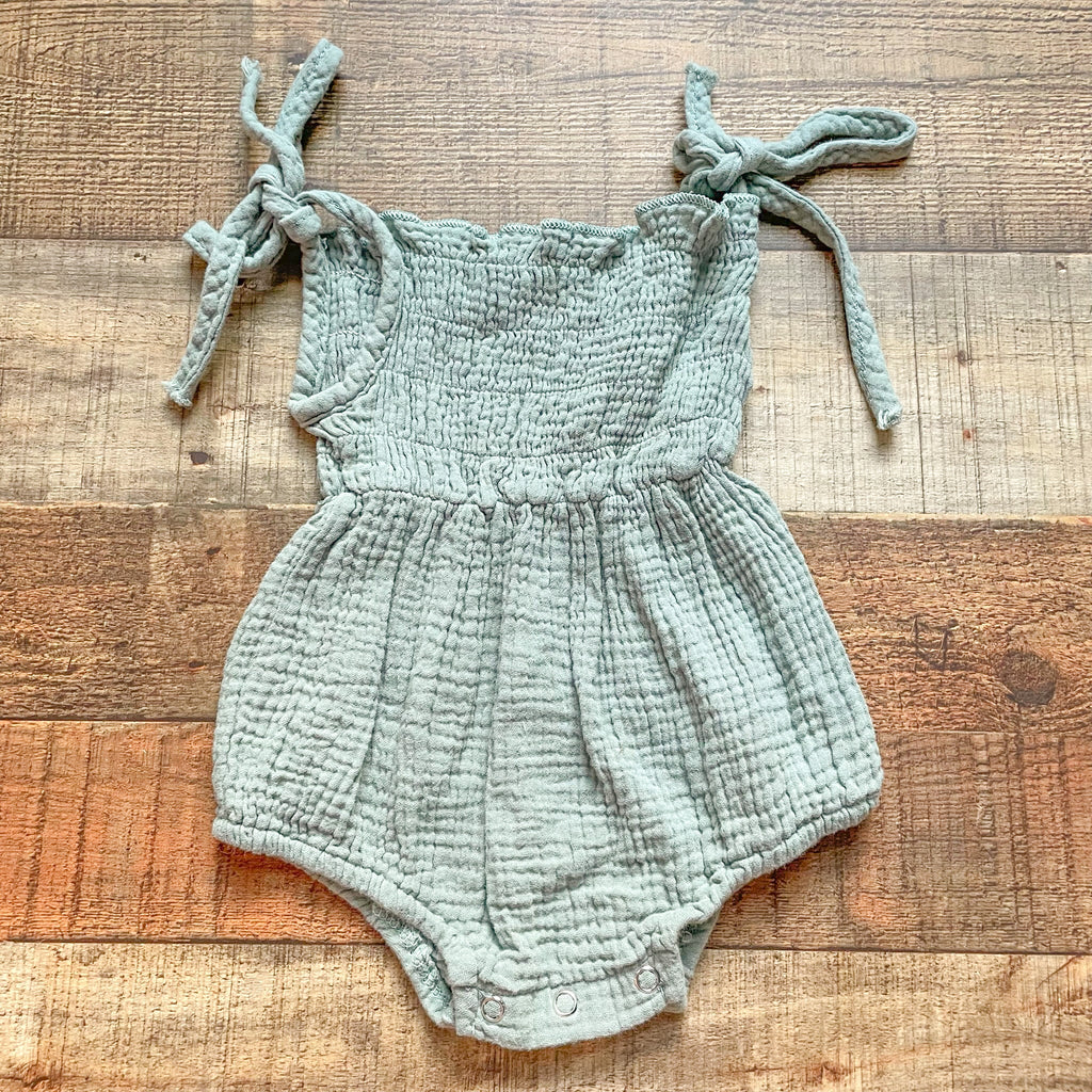 No Brand Baby Girl Green Smocked Tie Strap Muslin Romper- Size ~6-9M (see notes)