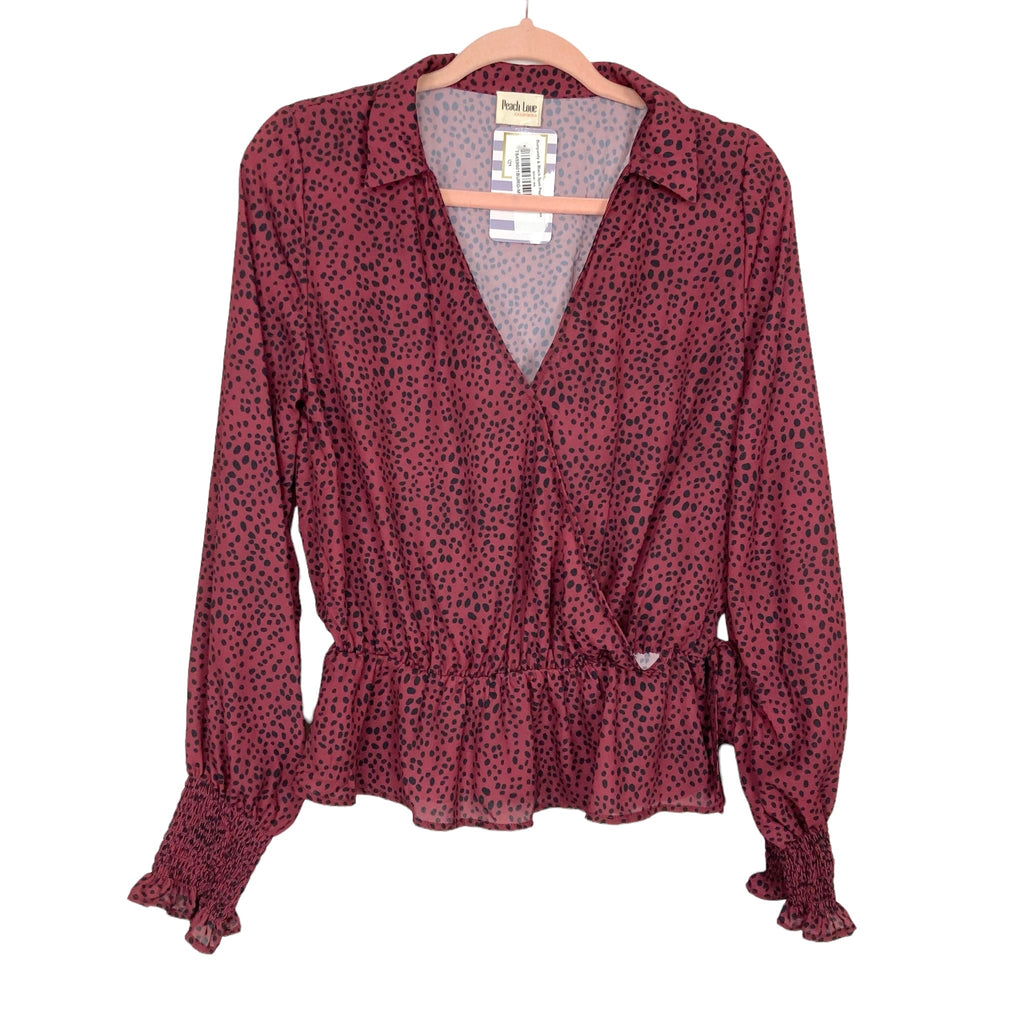 Peach Love Burgundy and Black Spot Front Snap Surplice Peplum Blouse NWT- Size M
