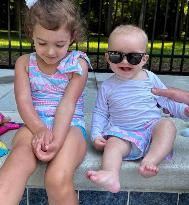 The Beaufort Bonnet Company Light Blue/Pink Beach Umbrella Swim Trunks- Size 6-12M