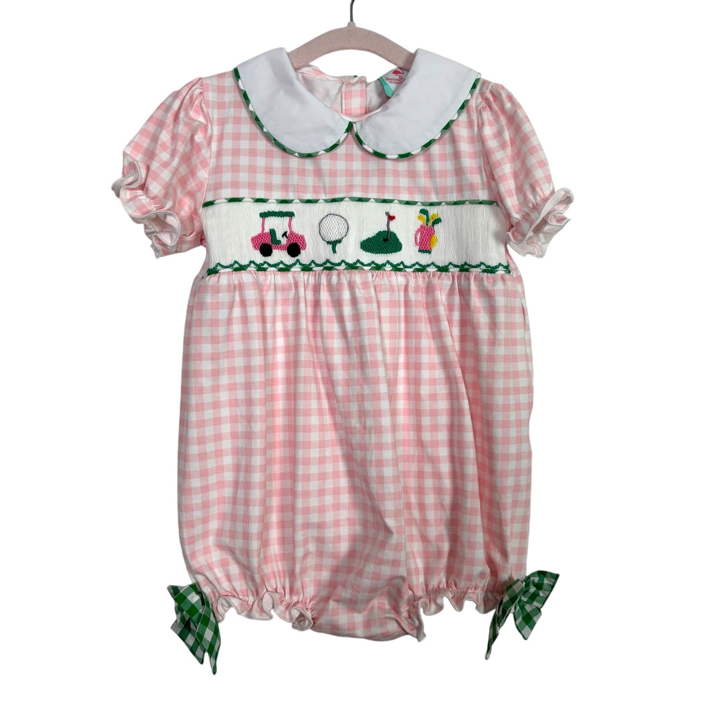 The Smocked Flamingo Children's Boutique Pink Gingham Golf Smocked Bubble- Size 3T