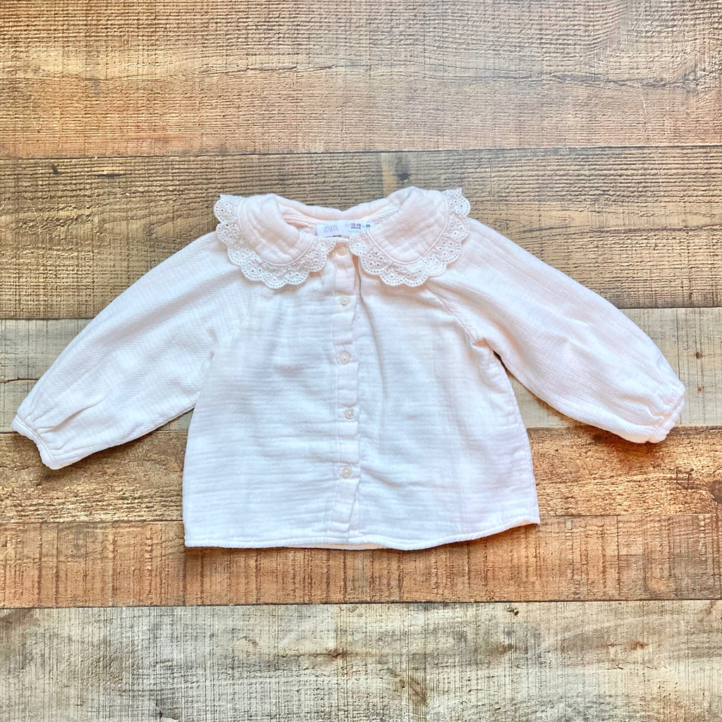 Zara Light Pink Lace Collar Button Front Top- Size 12-18M