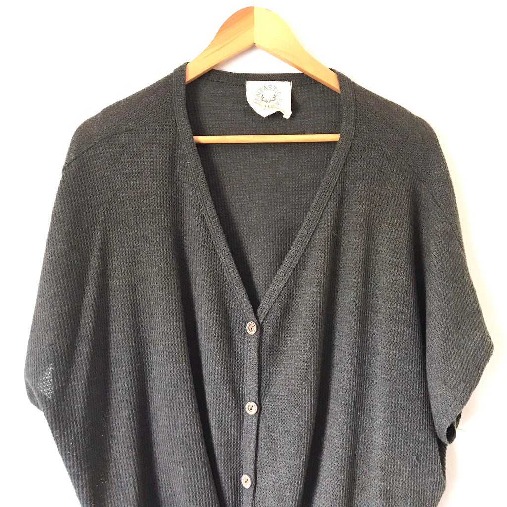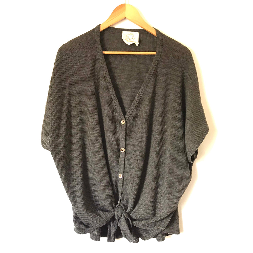 Fantastic Fawn Charcoal Grey Waffle Knit Tie Front Short Sleeve Top- Size S
