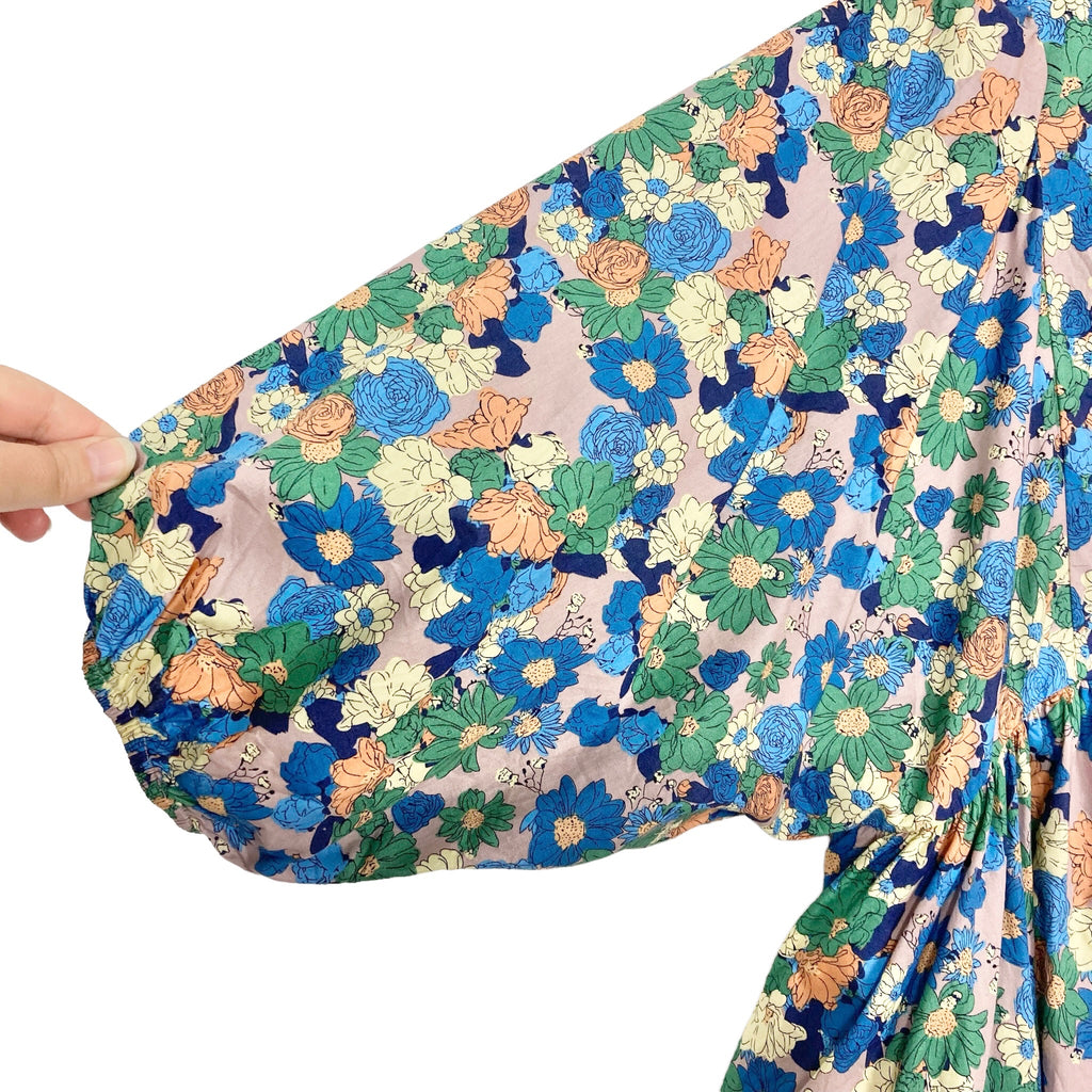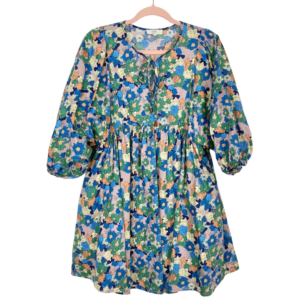 Entro Lilac/Blue/Green/Mustard Floral Front Tie with Balloon Sleeves Dress- Size S