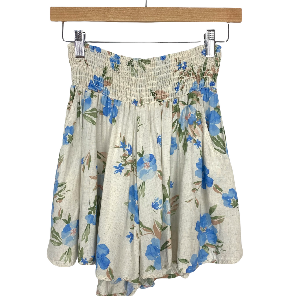 Final Touch Linen/Blue/Tan Floral Print Smocked Waist Shorts- Size S