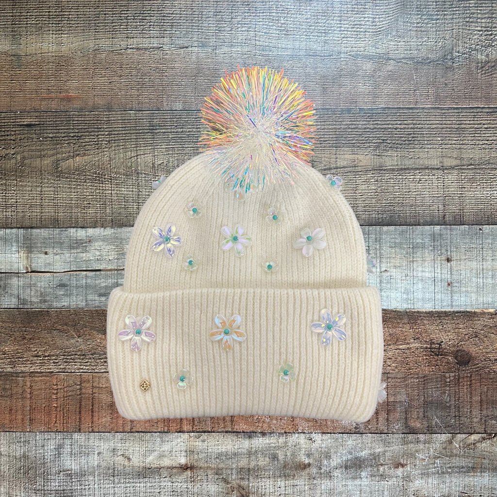 Brianna Cannon White Cashmere Flower Pom Pom Beanie