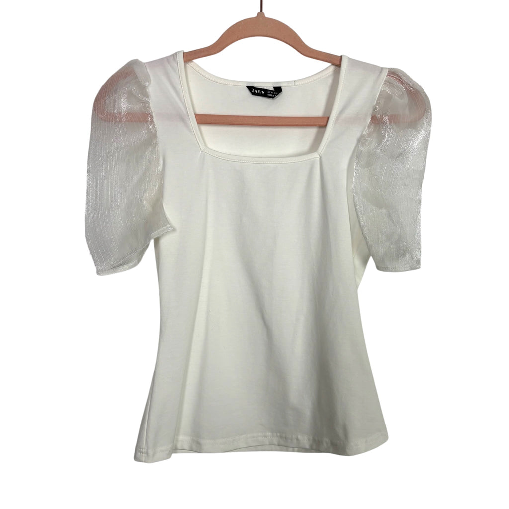 Shein White Metallic Sheer Puff Sleeve Top- Size XS