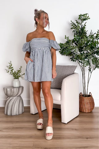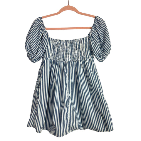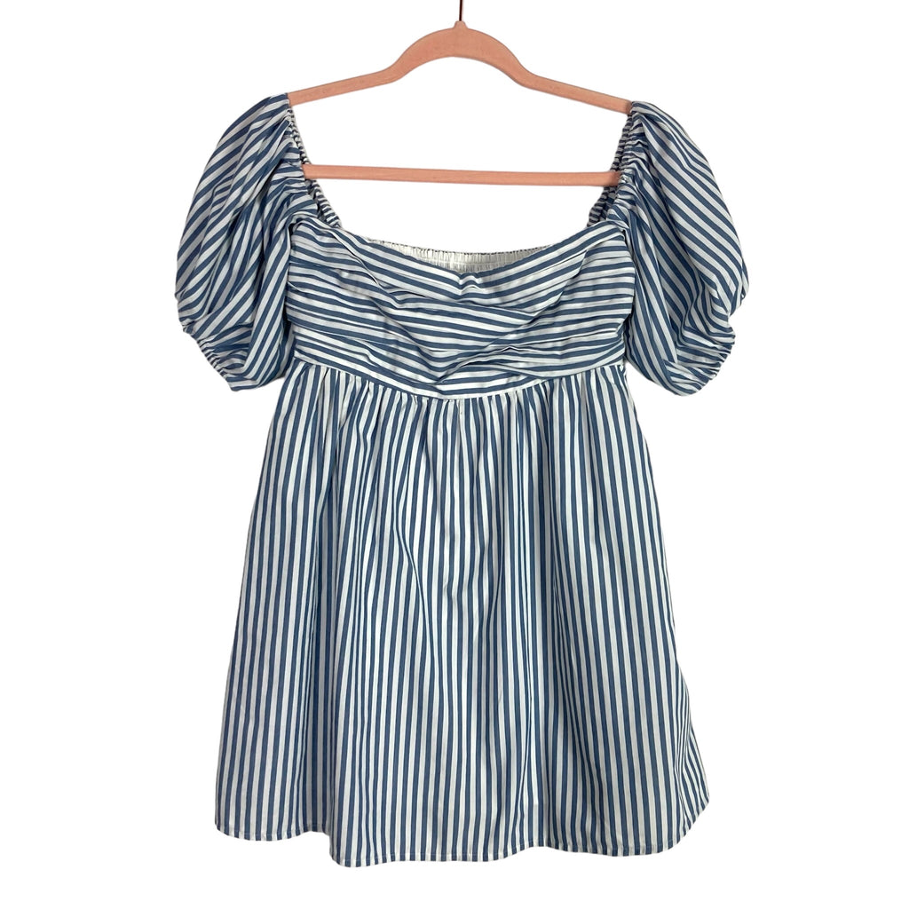 Abercrombie & Fitch Blue and White Striped Off the Shoulder Puff Sleeve Dress (with short lining!) NWT- Size S Petite (see notes)