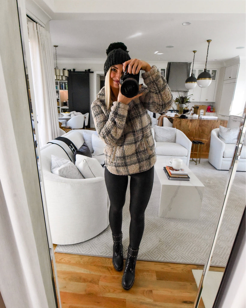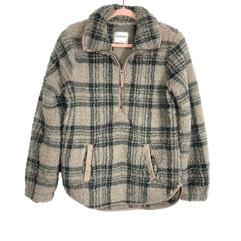 Abercrombie & Fitch Sherpa Tan and Grey/Green Faux Leather Trim/Pockets Quarter Zip Pullover- Size S