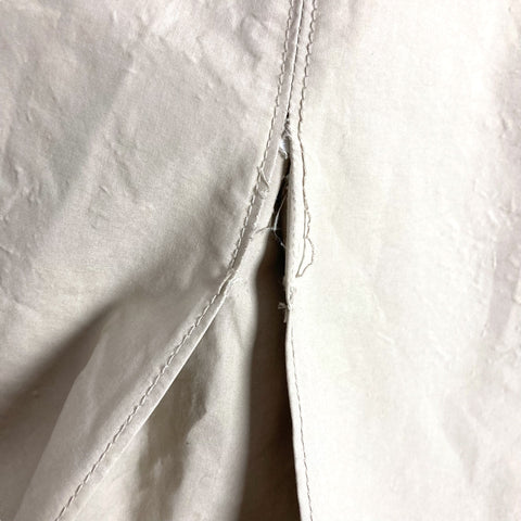 Signs of wear. Discoloration, cracked button on sleeve, and small tear in back pleat, see photos